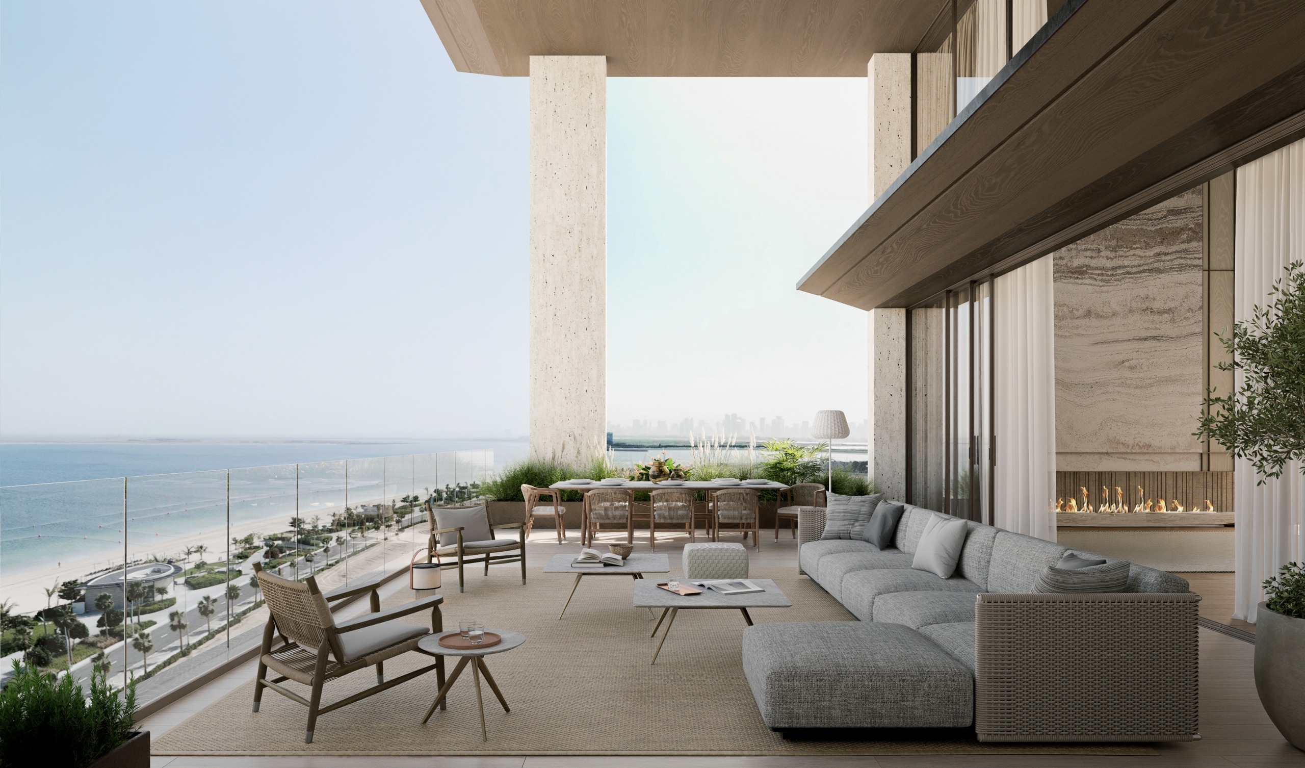 Each residence is crafted with bespoke Italian furniture, contemporary materials, and expansive layouts that merge indoor and outdoor living seamlessly. Floor-to-ceiling glass frames panoramic water views, while generous terraces create private spaces to unwind above the shoreline. Signature suites, townhouses, duplexes, and a limited collection of penthouses offer spacious living environments with meticulously curated interiors, concealed kitchens, serene lounges, libraries, and master suites enriched with spa-like bathrooms and walk-in closets.