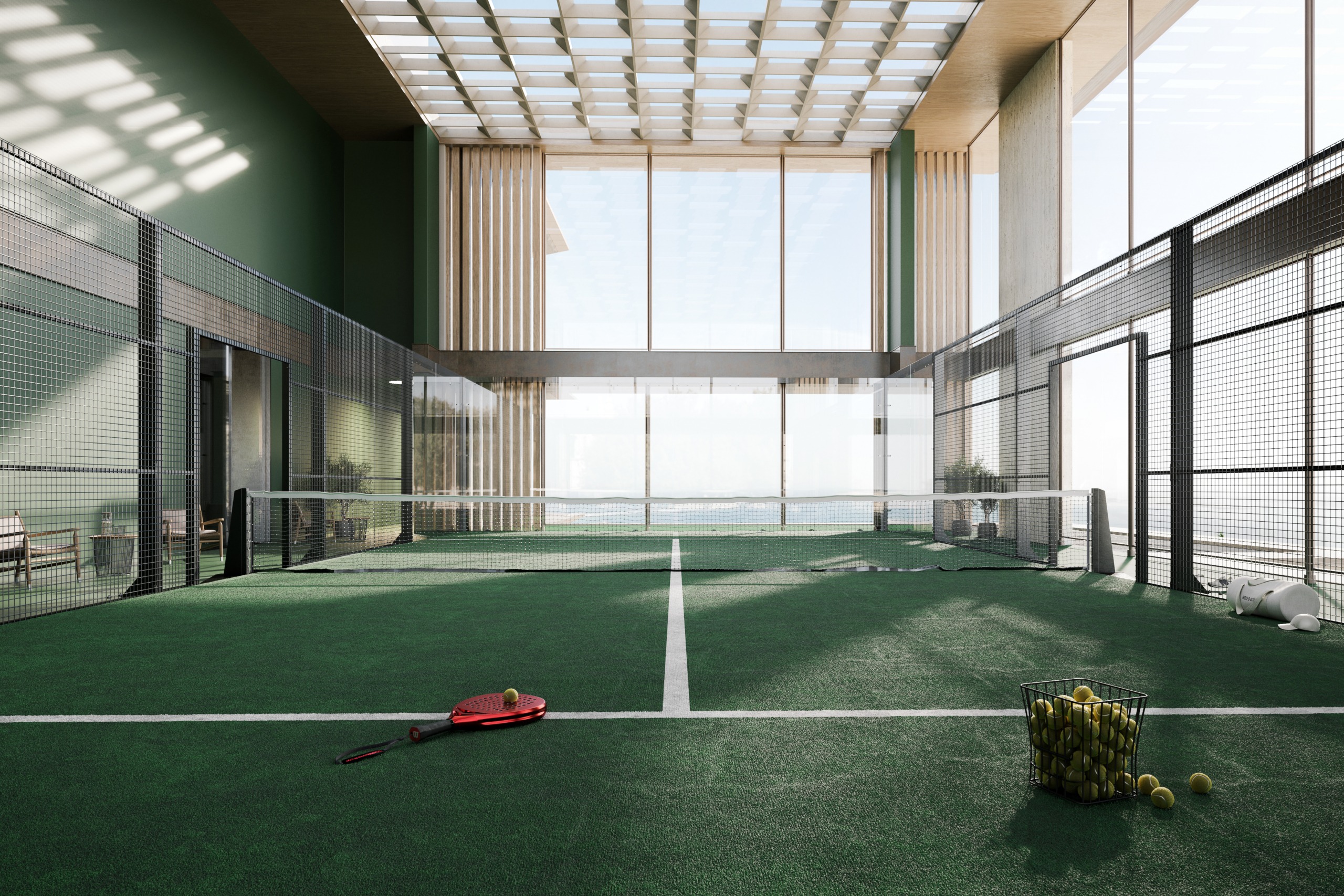 The amenities reflect a commitment to well-being and exclusivity. Residents have access to a spectacular infinity pool overlooking the sea, a state-of-the-art fitness center, a dedicated reformer Pilates room, and an expansive wellness spa featuring massage suites, an infrared sauna, a salt room, oxygen therapy, and hot and cold plunges. The development also features one of Dubai’s most distinctive attractions: the city’s first panoramic sea-view padel court, perched atop the building with sweeping views across the horizon.