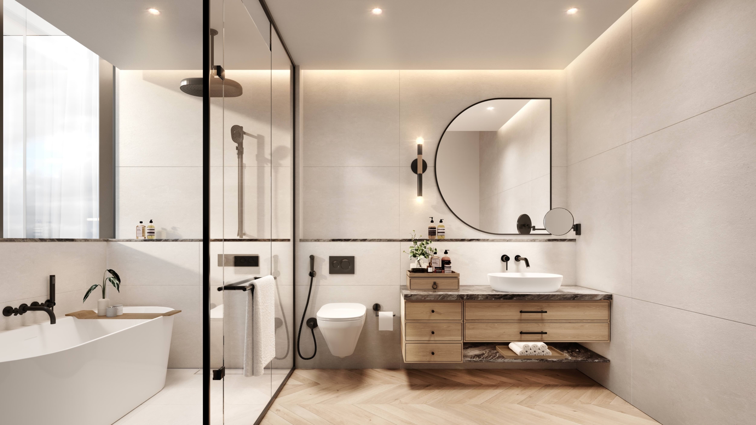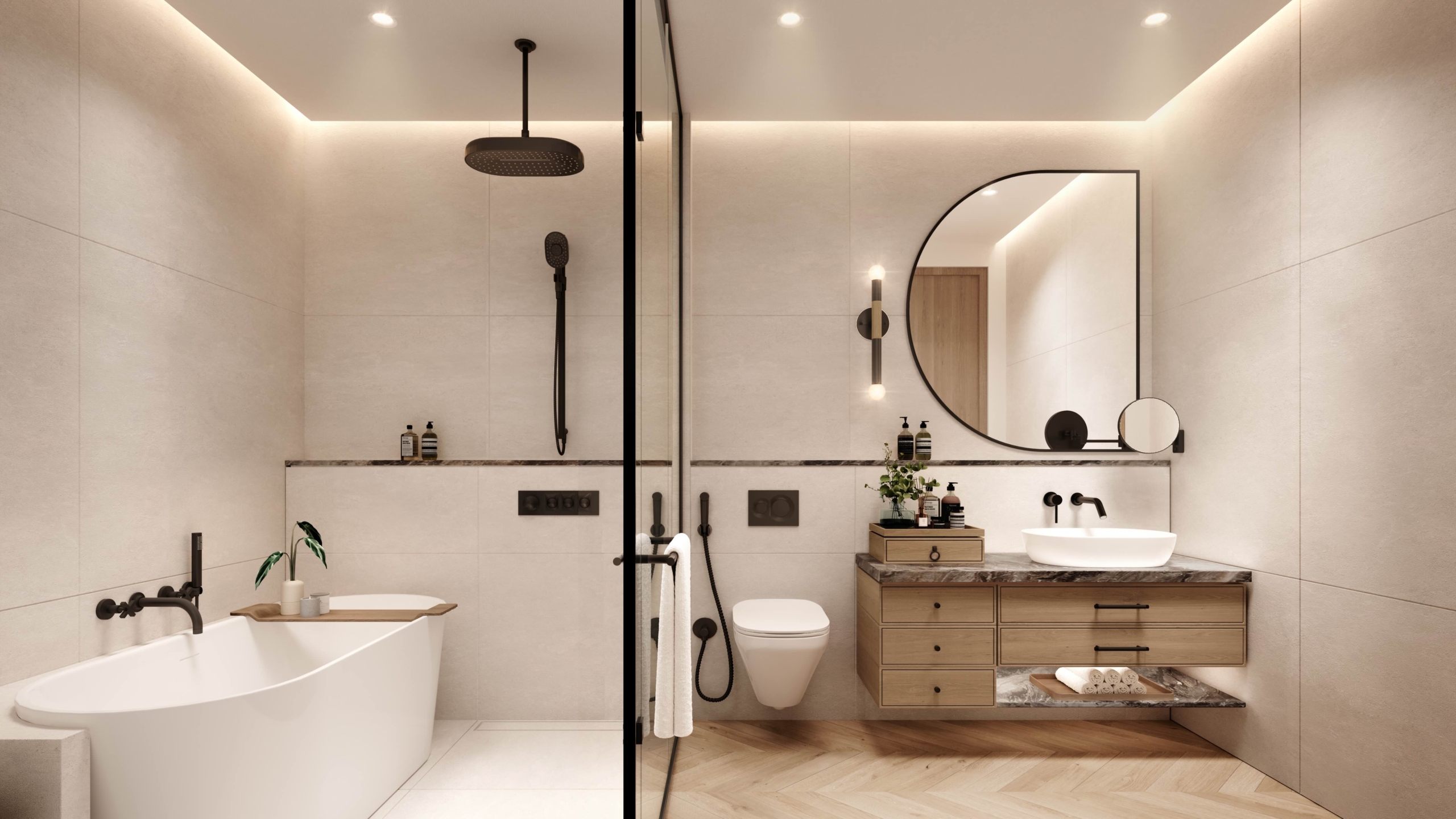 The bathrooms combine modern luxury with minimalism. They feature a freestanding bathtub, oak veneer cabinetry, marble-effect porcelain countertops, and matte black fixtures.